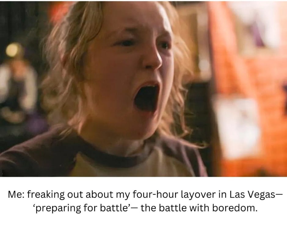 Long waits are like zombies threatening to devour my brain, and I hate them, so to prepare for the wait, my brain has it all under control. Let’s just call her Ellie. She’s constantly scanning for problems, my Ellie, even when there aren’t any for a lesser brain to find. But my Ellie is a fighter. She’s not a vigilante, but she is taking names and making a list of all the things that could go wrong on a long layover.