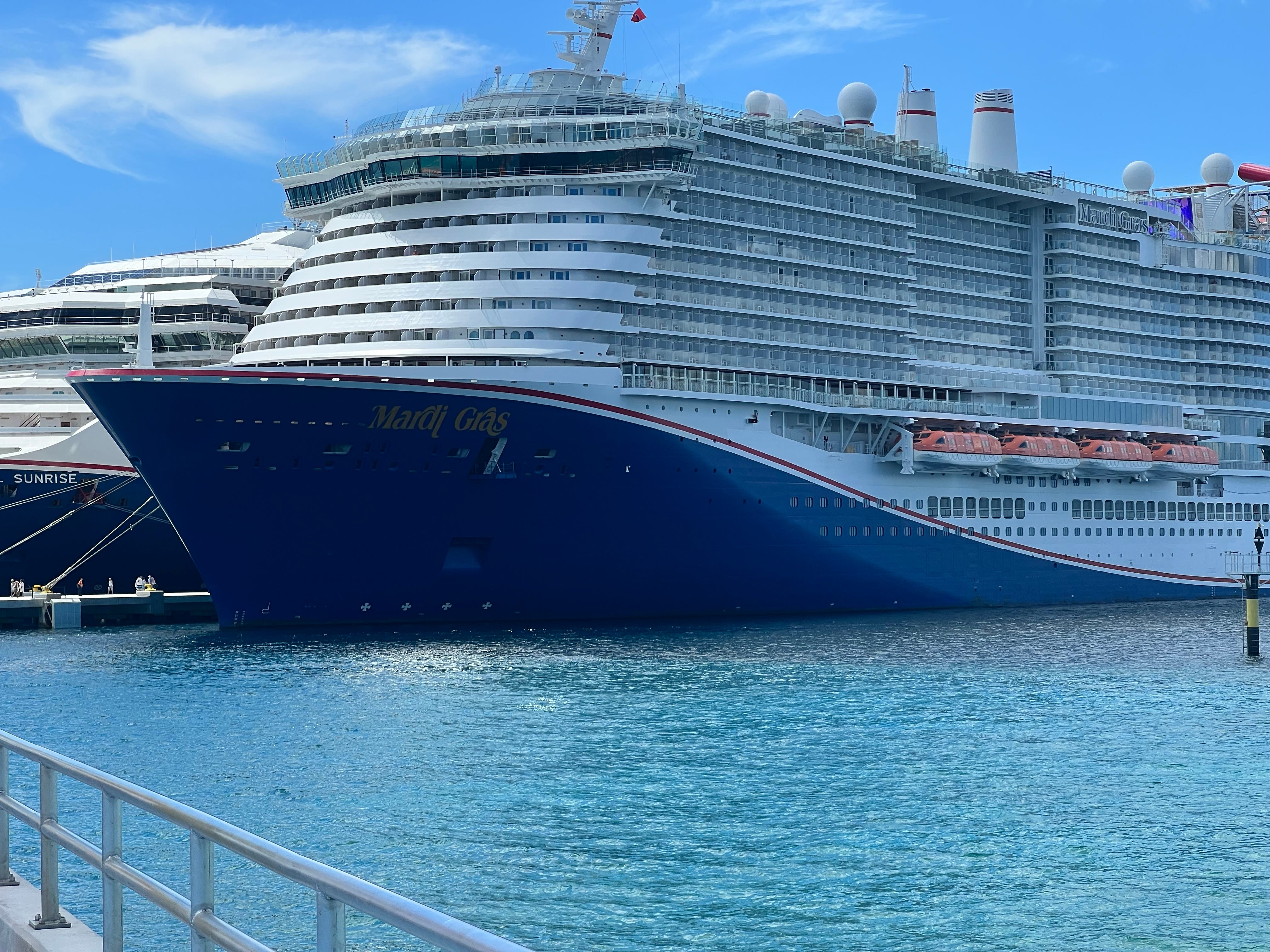 Or how a 19-story building can stay afloat. That’s the one currently on mind. Driving up to the Carnival Mardi Gras, my eyes pertnear popped out of my head, and I thought, “No way! There’s no way that thing’s not tipping over. Especially when the roller coaster runs out over the side of the ship and back again. You have to be kidding me!”