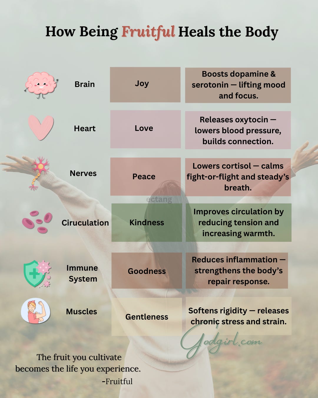 Here’s a glimpse of how the fruit of the Spirit doesn’t just shape your character and impact the lives of those around you, but it also brings healing to your whole body. The fruit you cultivate truly becomes the life you experience.