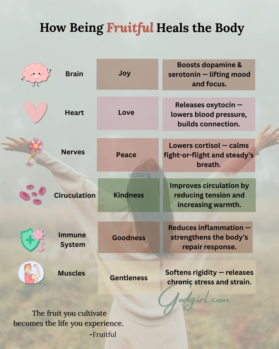 Here’s a glimpse of how the fruit of the Spirit doesn’t just shape your character or affect the people around you; it also brings healing into your whole body. The fruit you cultivate becomes the life you experience, touching your mind, your nervous system, and your physical well-being.